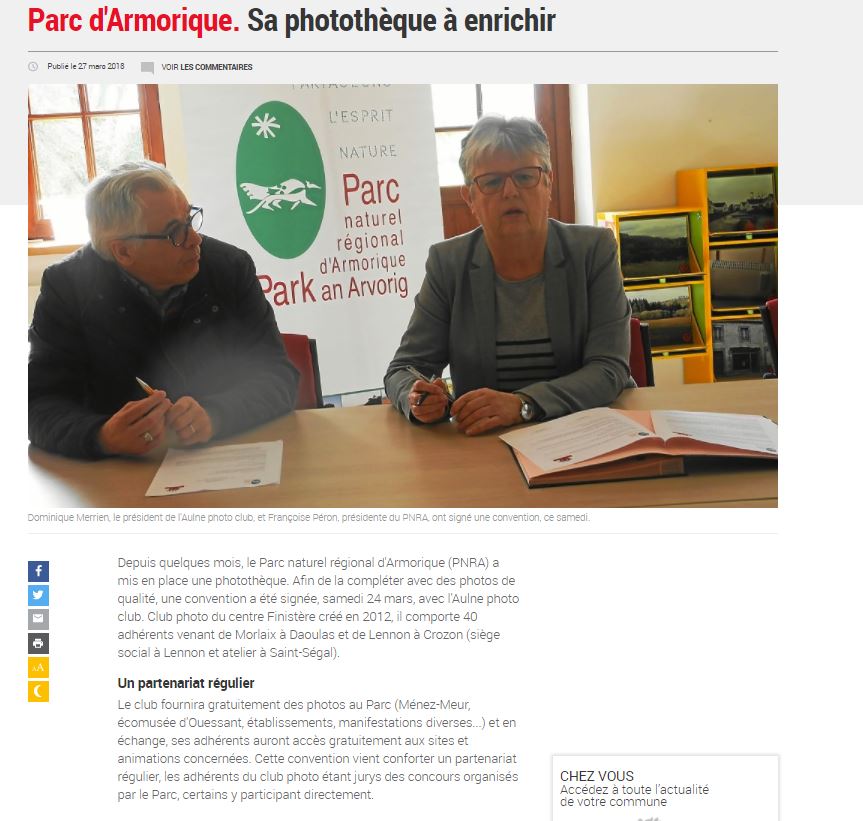 La signature a eu lieu Samedi 24 mars 2018 en présence de la présidente du PNRA, Françoise PERON, ainsi que la chargée de communication du parc et une délégation de l’Aulne Photo-Club dont notre vénéré président, Dominique MERRIEN.